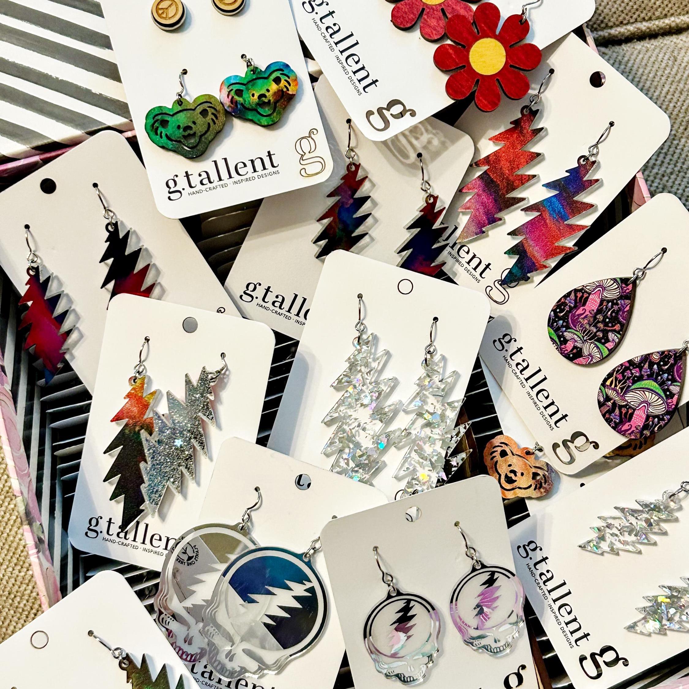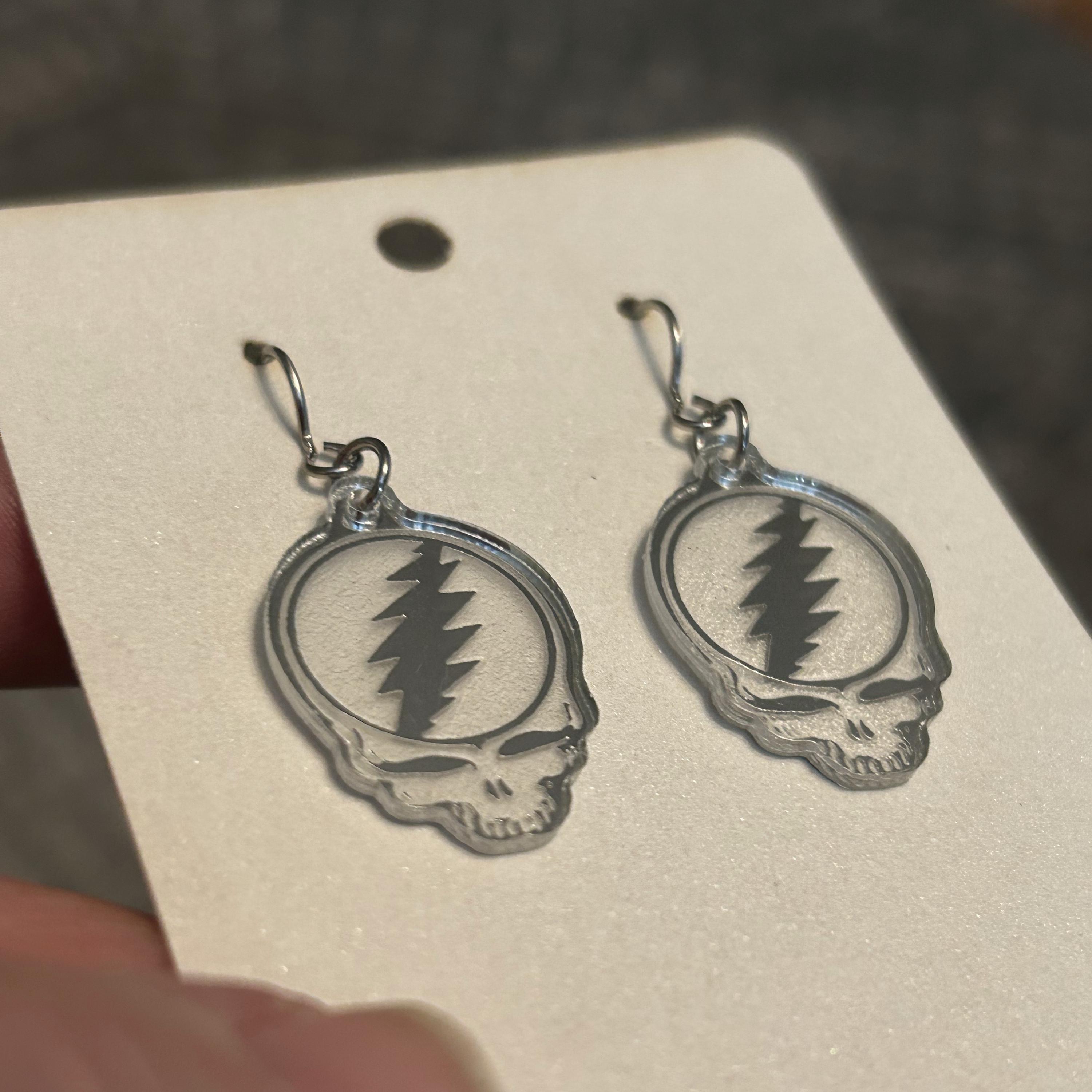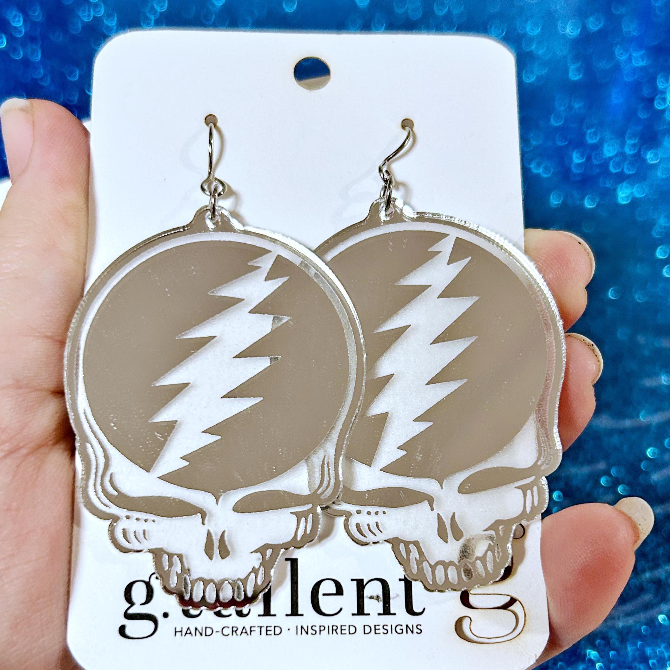 These precision laser-cut earrings feature the classic Grateful Dead “Steal Your Face” skull design with a lightning bolt at the center. Made from ultra-thin 1/16-inch (1.5mm) silver mirror acrylic, the engraved areas reveal clear acrylic, giving contrast and depth. The mirror finish reflects surrounding colors, making each earring subtly change with its environment.